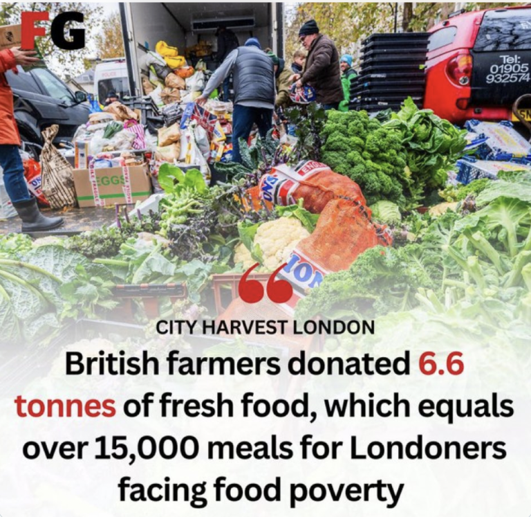 “Farmers donate 6.7 tonnes of food providing 15,500 meals for London food bank. Farmers from across the UK turned out in their thousands to fight Labour’s family farm tax, whilst donating vast amounts of British produce to a London food bank.”